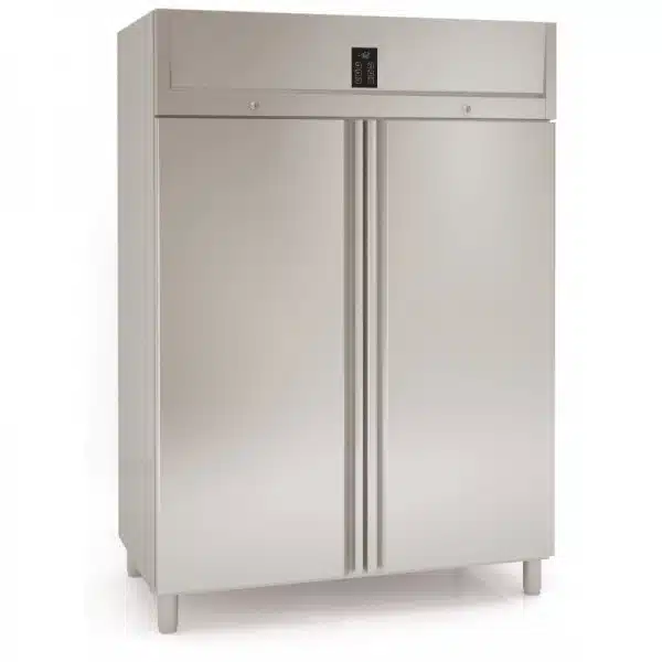 Armoire positive GN2/1, 2 portes pleines, côtés emboutis-isolation 85 mm, conçue pour la conservation de vos produits alimentaires. Dimensions : L 1395 x P 850 x H 2130 mm