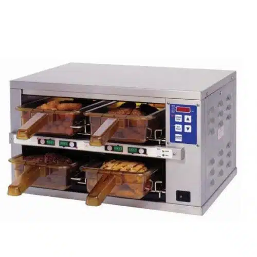 Coffre de maintien chaud avec systeme de contrôle indépendant de la température pour chaque tiroir. Déscription : 2 niveaux 6 bacs Dimensions : L 691 x P 358 x H 282 mm