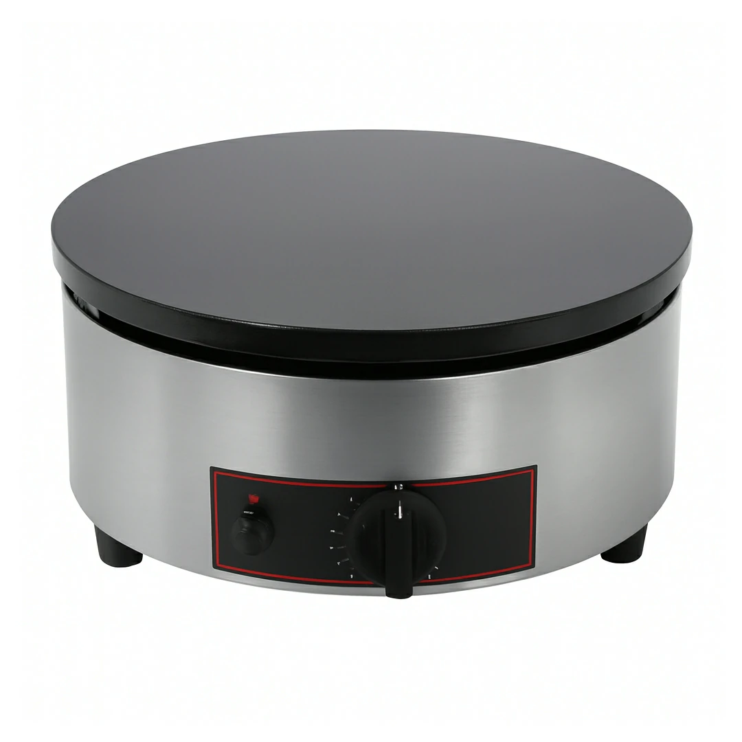 Crêpière à gaz en inox 3 kW, parfaite pour des crêpes savoureuses et rapides. Idéale pour les professionnels et les amateurs de cuisine Dimensions : Ø 400 x H 195 mm