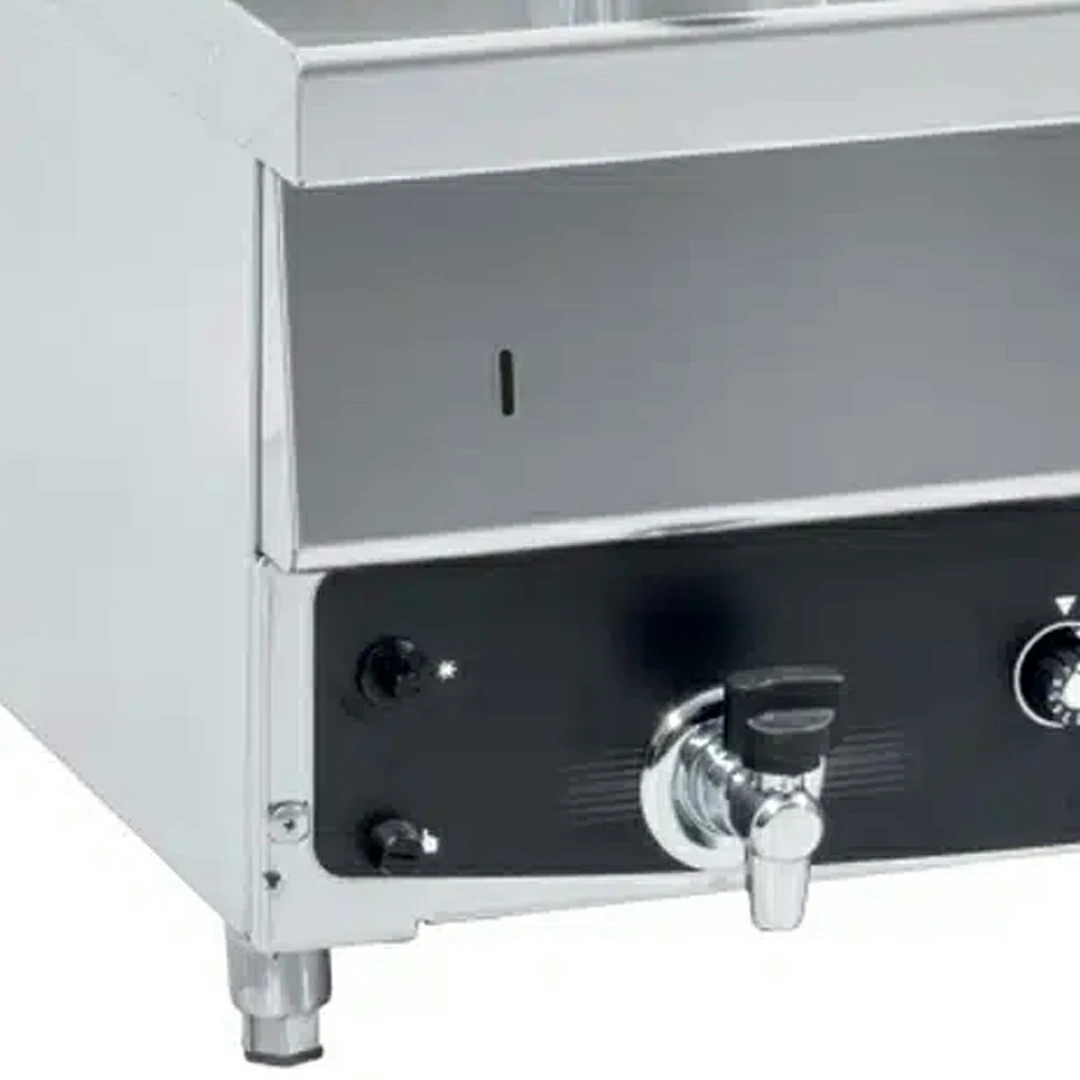 La cuve emboutie avec fond incliné facilite l’écoulement des résidus, tandis que l’allumage piezzo permet un démarrage rapide et sécurisé. Le thermostat intégré offre un réglage précis de la température de l’huile pour une flexibilité de cuisson. Des dispositifs de sécurité préviennent les risques de surchauffe, et le robinet de vidange simplifie l’entretien.