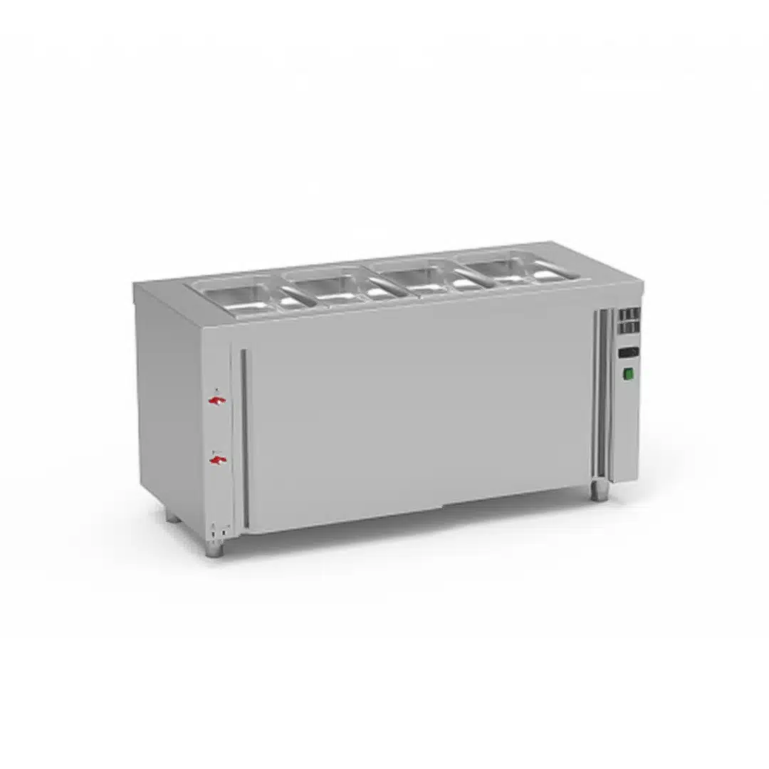 Ce modèle inclut une réserve très pratique pour les environnements professionnels. Ainsi, deux portes coulissantes facilitent l’accès aux produits. En outre, la réserve ventilée assure une température stable. Ensuite, un panneau de commande additionnel permet un réglage précis. De ce fait, vous ajustez la réserve entre +50 °C et +75 °C. Par ailleurs, un interrupteur lumineux indique clairement l’état de fonctionnement.