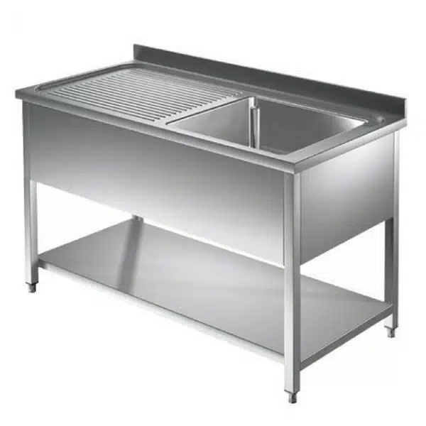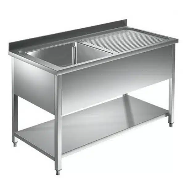 Plonge avec passage lave vaisselle sur pieds carrés, étagère pleine, en inox AISI 201, 1 bac, égouttoir a droite, L 1200 mm