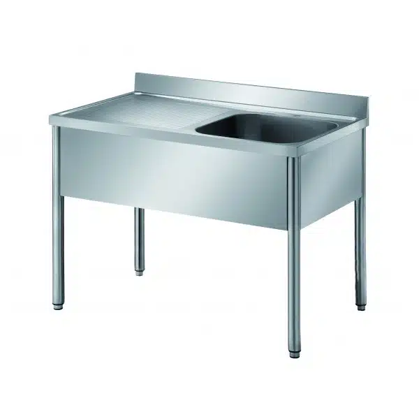Plonge avec passage lave vaisselle sur pieds carrés, étagère pleine, en inox AISI 201, 1 bac, égouttoir a droite, L 1200 mm